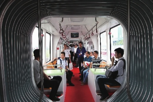 6月2日,客商在体验乘坐首次亮相的智能轨道快运列车。资料图